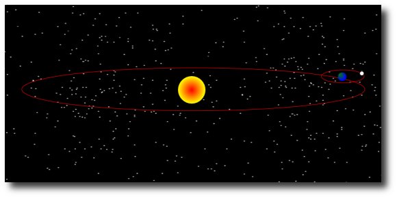 Или другой вариант — упрощённая модель Солнечной системы. Данный пример также интересен тем, что помимо анимации в SVG файле имеется и внедрённое растровое изображение в формате PNG — это собственно звёздное небо, используемое в качестве фонового рисунка. Согласитесь, что аналогичной гибкости мы не получим ни с одним из других популярных графических форматов (открыть пример в браузере).