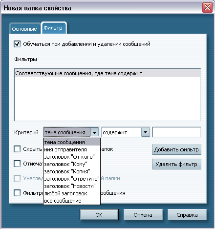 Создаётся новый Просмотр очень легко. Щёлкните правой кнопкой мыши на любом свободном месте панели Почта (в Сервис-панели) и увидите контекстное меню, в котором предлагается создать новый Просмотр (в русской локализации Opera он для привычности назван "Новая папка". Прим. переводчика). Выберите этот пункт меню и дайте новому Просмотру имя. Затем нажмите Alt + Enter, чтобы открыть диалоговое окно Свойства.